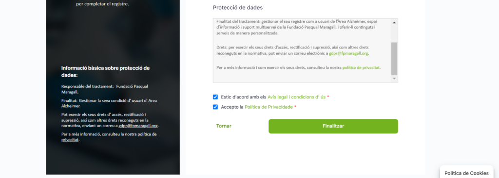 2. Una vegada hagis emplenat els diferents camps amb la teva informació i acceptis la política de privacitat i d’ús de l’aplicació, clica en el botó “finalitzar“.